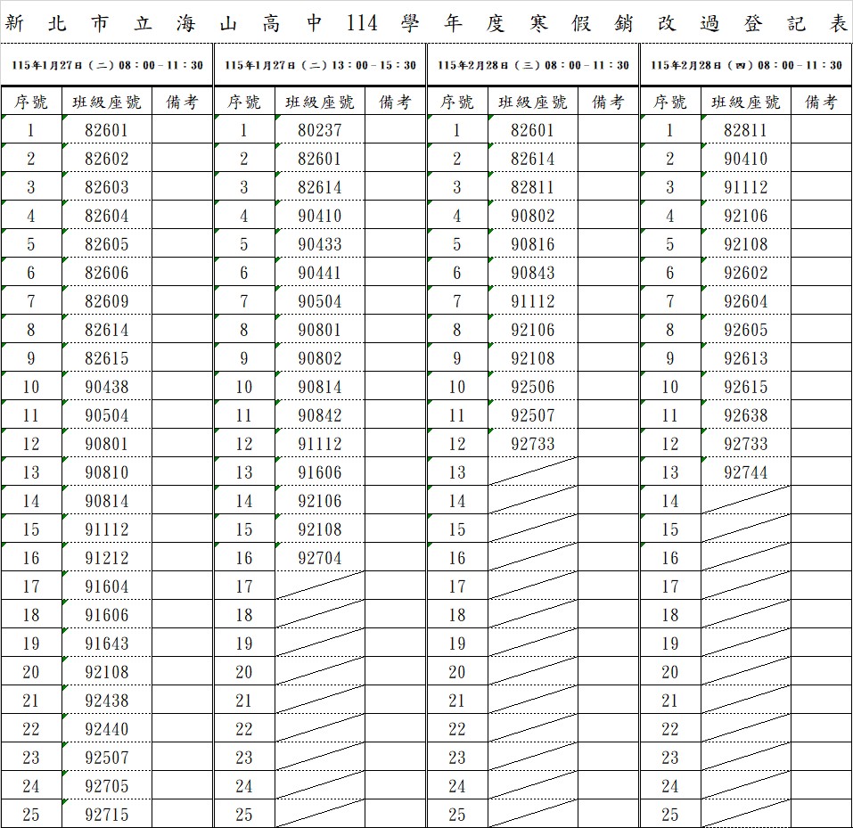 114學年第一學期國中部寒假銷改過開放時間為1月27、28日(兩全天) ,相關注意事項暨登記名冊。