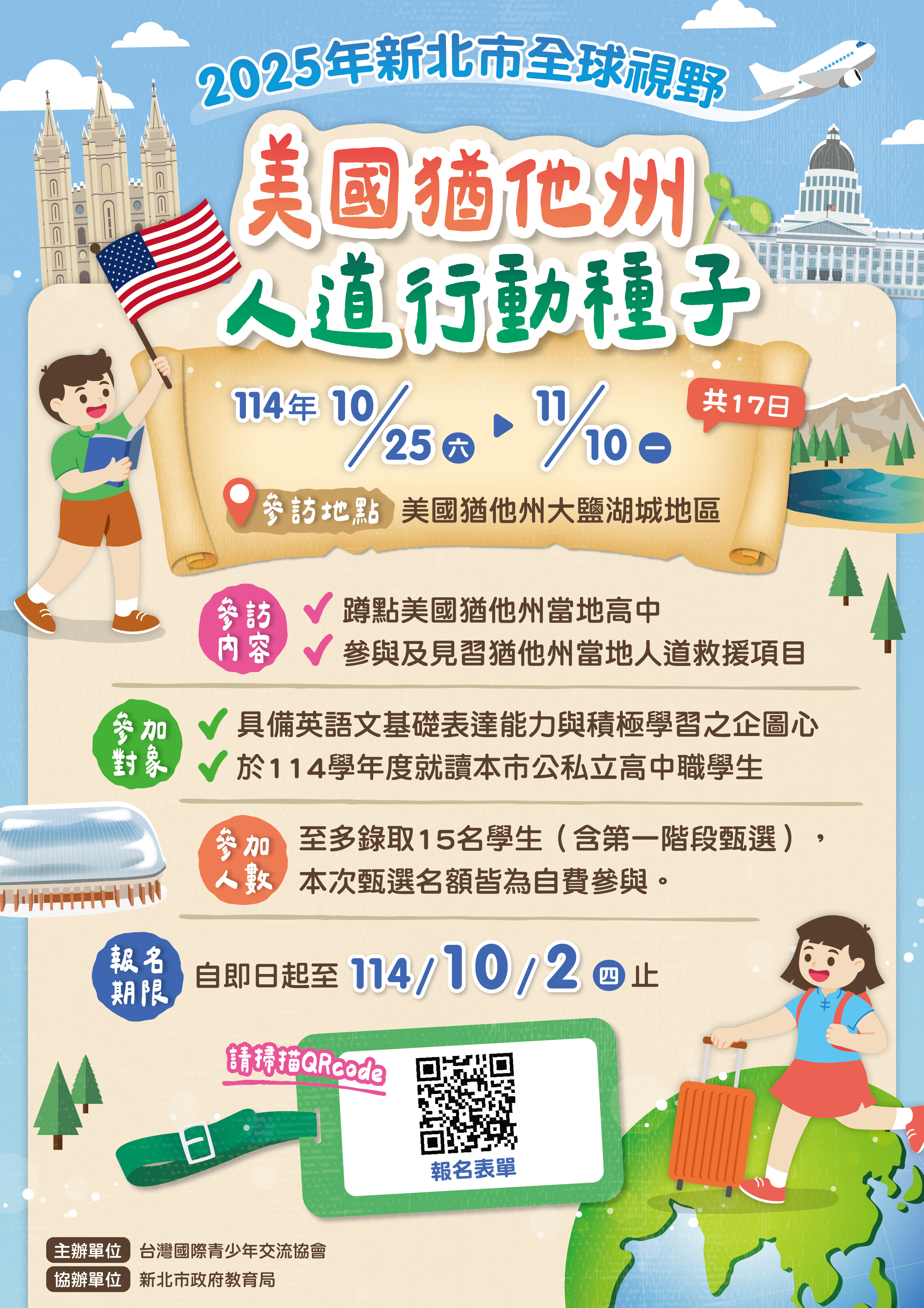 轉知:台灣國際青少年交流協會與新北市教育局合作辦理「2025年新北市全球視野-美國猶他州人道行動種子實施計畫」