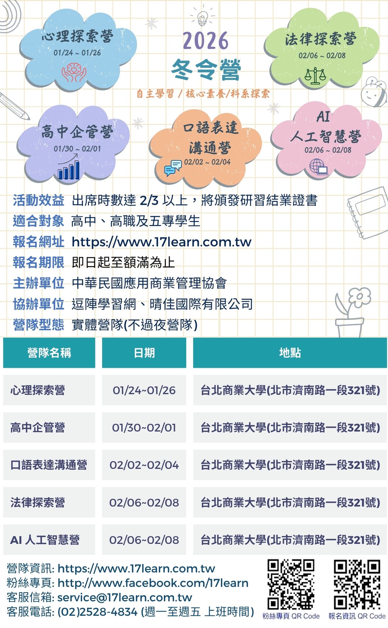 【轉知營隊活動】中華民國應用商業管理協會辦理「2026 寒假冬令營-卓越領袖探索系列」訊息