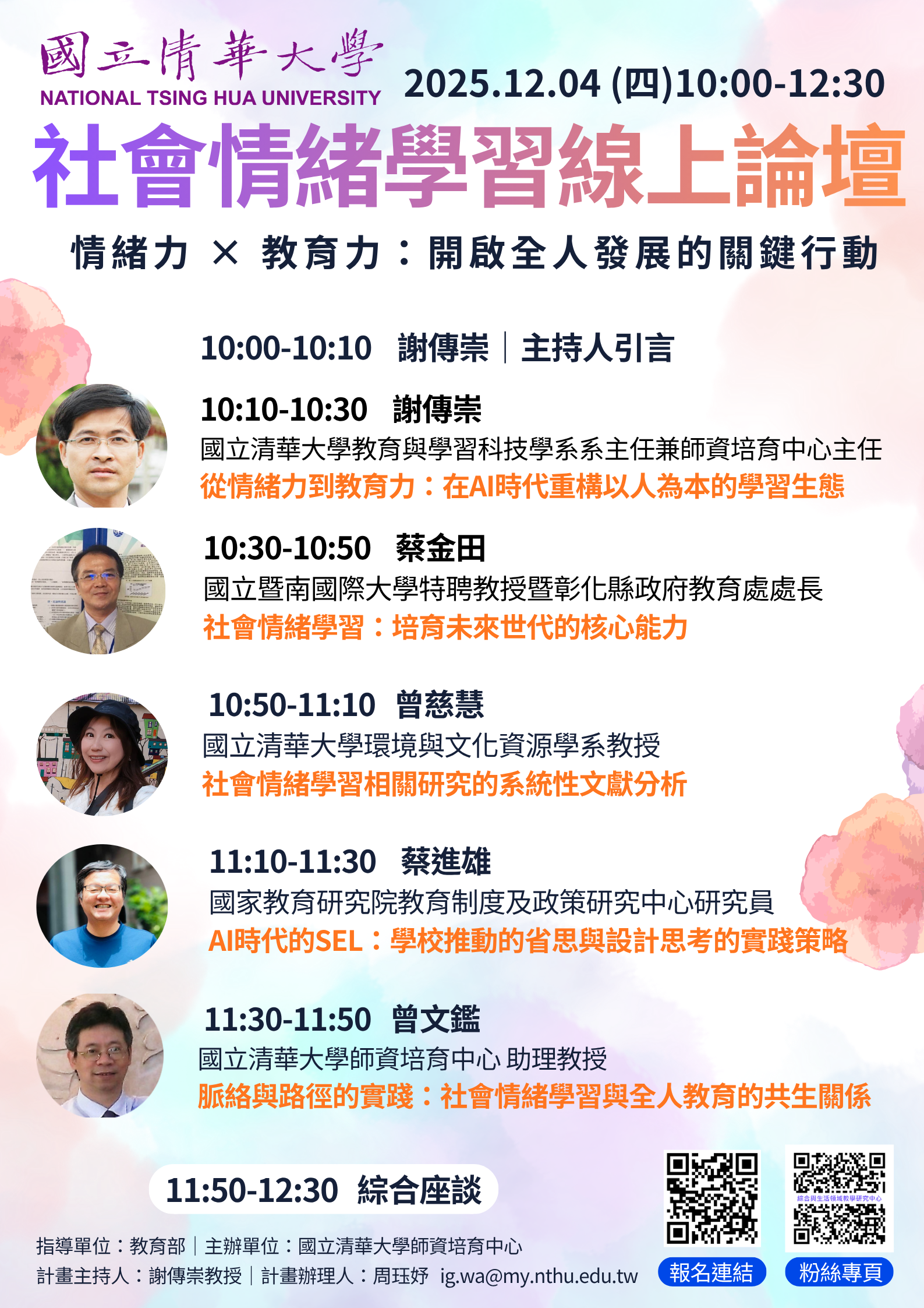 旨揭論壇以「社會情緒學習線上論壇-情緒力 × 教育力:開啟全人發展的關鍵行動」為主題,聚焦於社會情緒學習在教育領域的應用與發展,探討如何透過提升情緒能力,促進學習者在AI時代的全人發展,並分享相關研究成果與實踐策略,為教育工作者提供具體的行動方案與啟發。